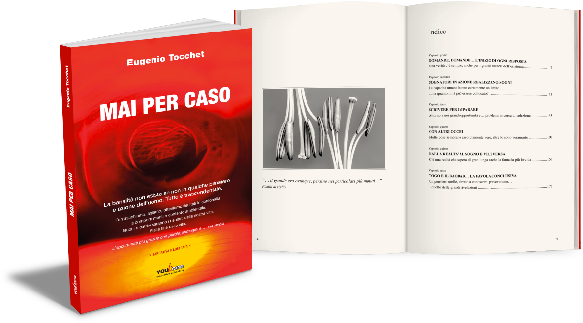 Scrutare e interpretare la grande realtà, catturare l'ispirazione, ha dato vita alle mie stampe fine art per quadri contemporanei e al mio romanzo illustrato ad impronta saggistica, "Mai per caso", dalle cui pagine emerge caparbiamente una domanda: "Se avessi una bacchetta magica capace di realizzare un solo desiderio, quale vorrei che fosse?" In altre parole, qual è la cosa che più conta nella vita? L'obiettivo supremo? Non saprei immaginare una risposta più verosimile di quella che dimora nella trama dell'invisibile... osservata con altri occhi.